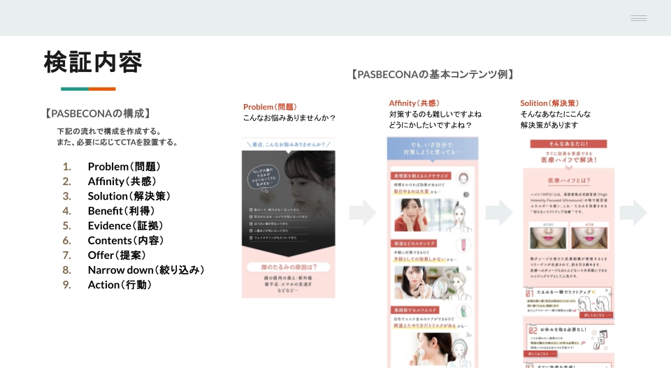 よって、原因→改善方法→ベネフィットを示し、それを裏付ける証拠を提示することで、購買意欲を高められるフレームワーク「PASBECONA」で検証。